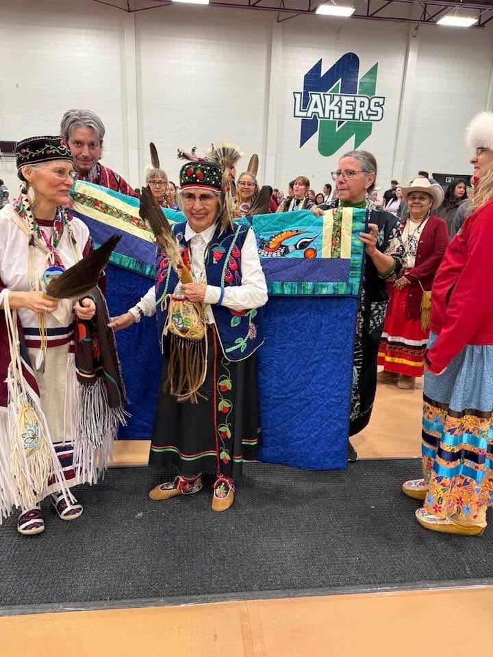 Honouring Our Elders – the focus of this year’s pow wow – acknowledges the importance of knowledge keepers and teachers. As part of the celebration, Canadore’s Head Elder and Grandmother-in-Residence, Lorraine Liberty-Whiteduck, was recognized for her years of service to the college community with the presentation of a star blanketThe recognition came as a surprise to her because her work is guided by care and commitment rather than expectation of acknowledgment.