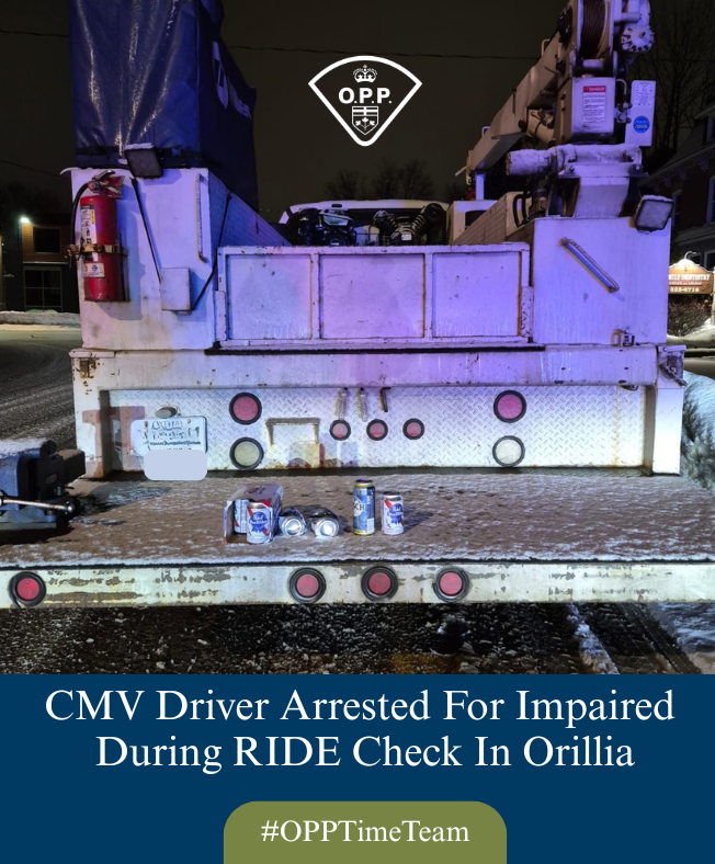 Members from the Central Region Traffic Incident Management and Enforcement (TIME) Team, with assistance from the Orillia Detachment of the Ontario Provincial Police (OPP) conducted a RIDE program on Neywash Street in Orillia, resulting in the impaired charges for a commercial motor vehicle (CMV) operator.