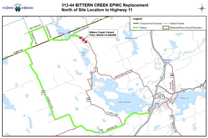 The District of Muskoka is replacing the Bittern Creek culvert with a new structure. To ensure this work is completed safely and ahead of the spring thaw, construction and a full road closure on Ravenscliffe Road (also known as Muskoka Road 2), near Old Novar Road, are scheduled to take place starting the week of March 2. Work is anticipated to be completed in April 2026.