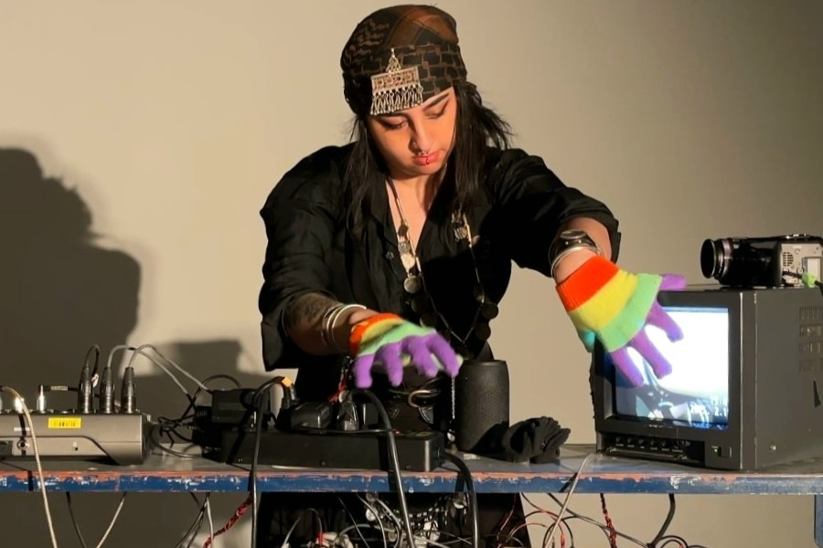 On February 21st at NAISA, Aliyah Aziz performs her work Sandpaper Hammock in-person and online that starts at 7 pm at NAISA. In her performance she will be wearing custom-made gloves that will draw out electromagnetic sounds from old CRT monitors, a camera, and other electric signals. She will mix and layer these sounds with spoken word, electronic pedals and loopers. There is a line in the text of her piece that she repeats, “Just because you cannot hear it, that doesn’t mean it is not there.” After repeating that line, she then slices it up and distorts it into a stuttering rhythm that is woven into a sonic tapestry of radio static, video signal, feedback, and electromagnetic frequencies. To her, all sounds “have a voice.” That concept underscores the Sound Culture ethos of the 2026 edition of Deep Wireless.