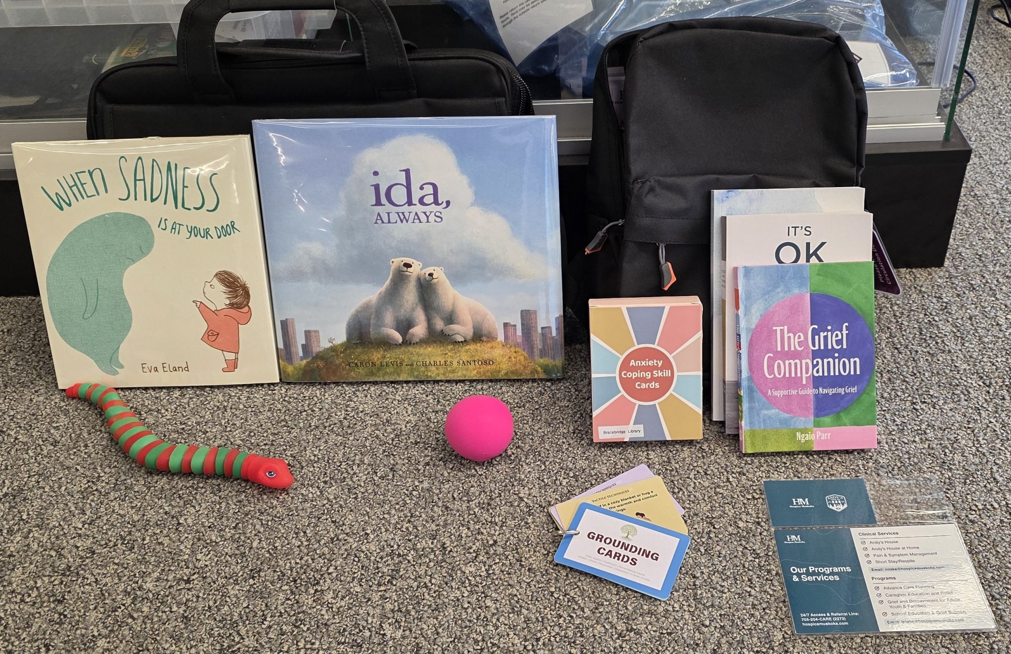 The support kits are designed to provide comfort, education, and practical coping tools for children navigating the loss of a loved one. Both include carefully selected books and laminated grief information sheets that help individuals understand and process grief while offering compassionate guidance, along with coping skills and grounding cards for adults & teens and sensory toys for children to support emotional regulation, reduce anxiety, and reconnect with the present moment.