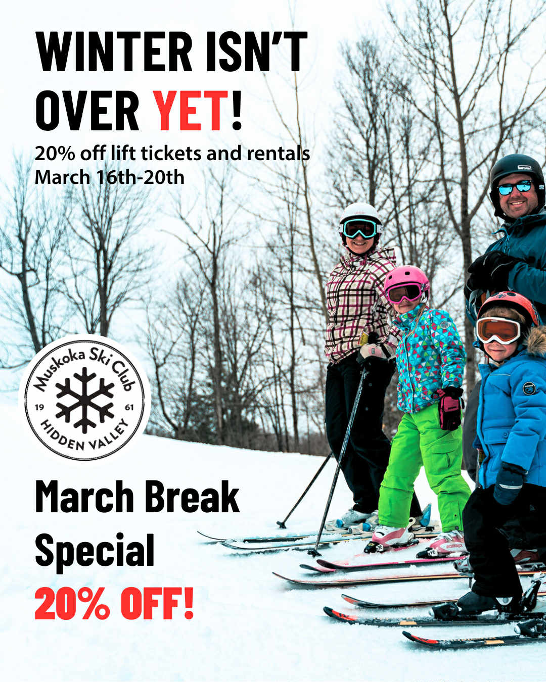 Winter isn’t over yet — and neither are the deals! We’ve still got TONS of snow and aside from a little rain on Monday, the forecast is looking incredible for spring skiing conditions all week long. There’s never been a better time to get on the hill! Celebrate March Break with 20% off lift tickets AND rentals, March 16th–20th.