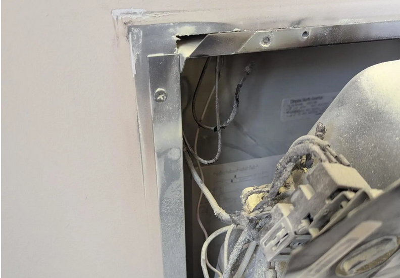 The fire started inside a recessed wall heater located in a stairwell. Staff quickly noticed the problem, chose the correct extinguisher, and safely put the fire out before it could spread.