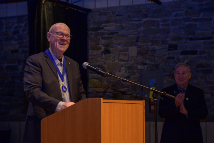 Jim Ferris addressing crowd after being awarded the 2025 Order of Parry Sound. In the background is Mayor McGarvey applauding. Photo: Thom Morrissey