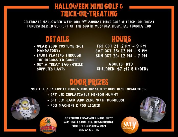 Get ready for some spooky fun! South Muskoka Hospital Foundation is excited to announce Northern Escapades Mini Putt is hosting the 9th Annual Halloween Trick or Treat Mini Golf event, with all proceeds going directly to support South Muskoka Hospital Foundation. Last year’s event raised $1,972.15, which Northern Escapades matched and rounded up bringing the total donation to $4000.00 to South Muskoka Hospital Foundation.