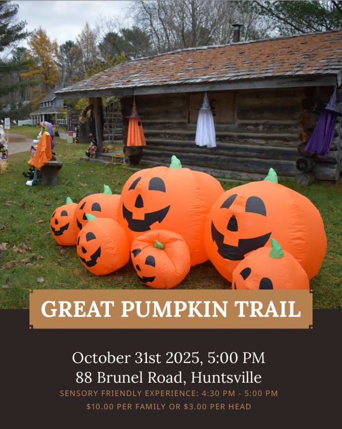 The Great Pumpkin Trail is back for its 37th anniversary at Muskoka Heritage Place (88 Brunel Road) on October 31, 2025, from 5:00 to 7:30 pm. This family-friendly Hallowe’en event is a traffic-free trick-or-treat experience, helping to keep kids safe and parents at ease. Autism Ontario will be onsite from 4:30 to 5:00 pm for those looking for a more sensory-friendly experience.
