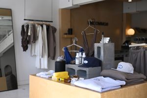 This summer, Gregorio brought Uncommon home. The brand’s first storefront opened in June, above Duke’s in Port Carling, with its windows open to the lake and light spilling across the floor. Inside, it’s raw and restrained — the stainless steel counters rest on stacked cinder blocks, with folded hoodies, swimwear and accessories placed neatly on soft wood tables. There’s a fridge with cold drinks, a breeze off the bay, and just enough room between the racks to let the clothes breathe. Gregorio is there most days, chatting with locals, explaining the brand, swapping stories.